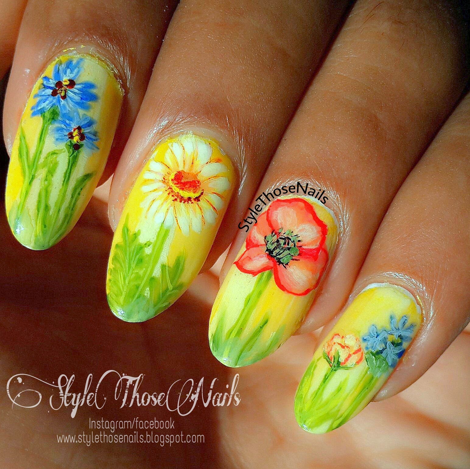 I started with a white base and then applied scotch tape to mask the area where I didn't want yellow polish. I applied yellow polish and removed the tapes. After I got crisp strips I sponged a light yellow color all over nails to get blended strips effect (if that makes sense :P). Then just copied down the flowers from napkin. I used watered down colors to create base of flowers then built it up with different shades to make it look like painting :) Lastly sealed it with top coat.